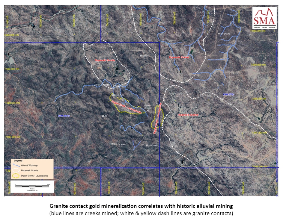 The aerial photograph below shows the extent of alluvial mining in this district. One notable feature is that the source of gold appears to correlate with granite contacts. In the field mapping has shown extensive granite contact gold mineralization is spread over a wide area.