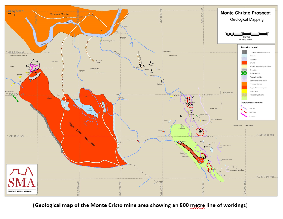 Detailed mapping of the Monte Cristo mine area has shown the mineralization is present in greisen (altered country rock) along the contact with the Digger Creek leucogranite. A selvedge of pegmatite lies on the eastern contacts of this granite. As this pegmatite has been shown to also contain gold mineralization the potential exists for a porphyry deposit to underlie the area.